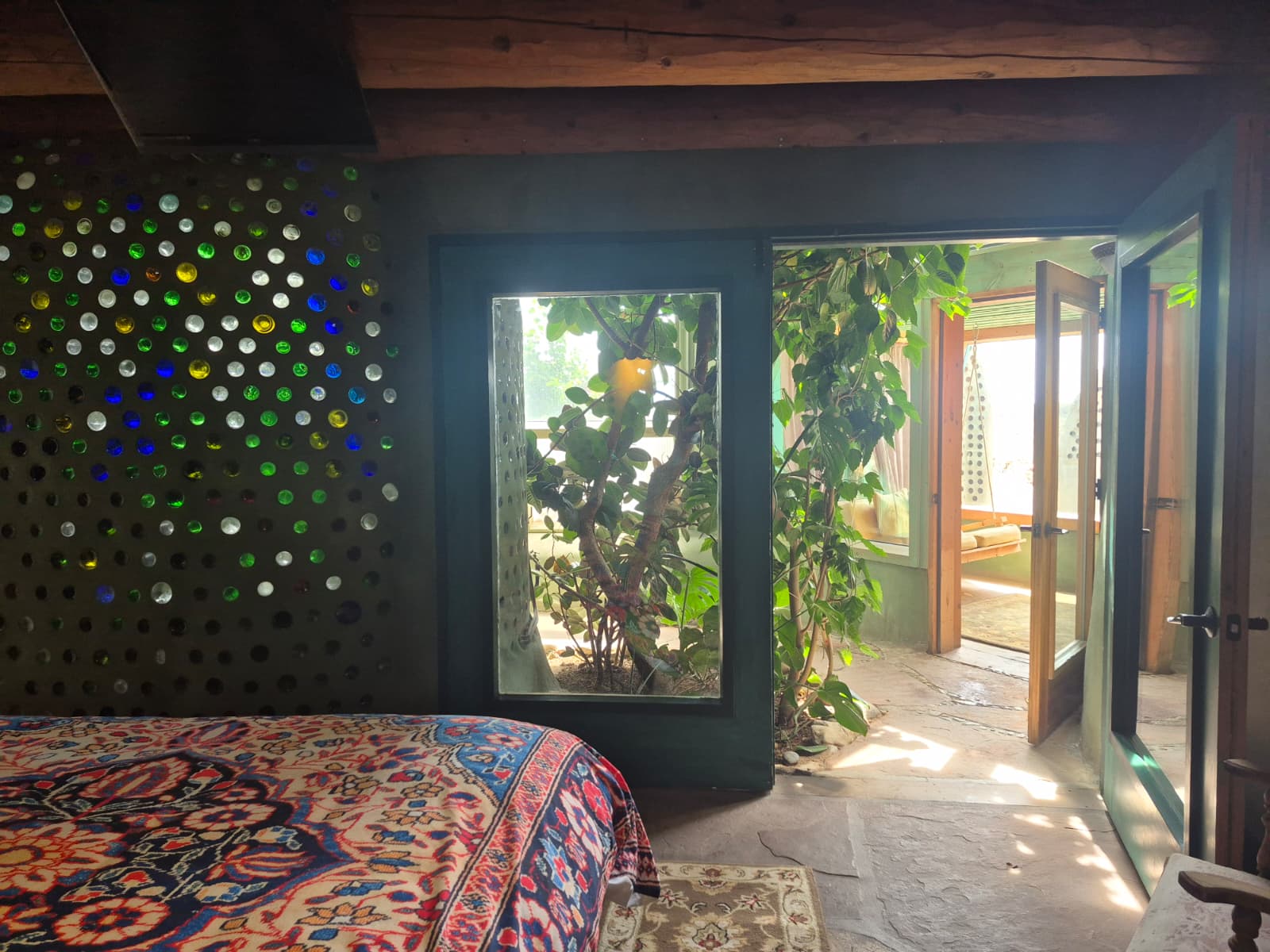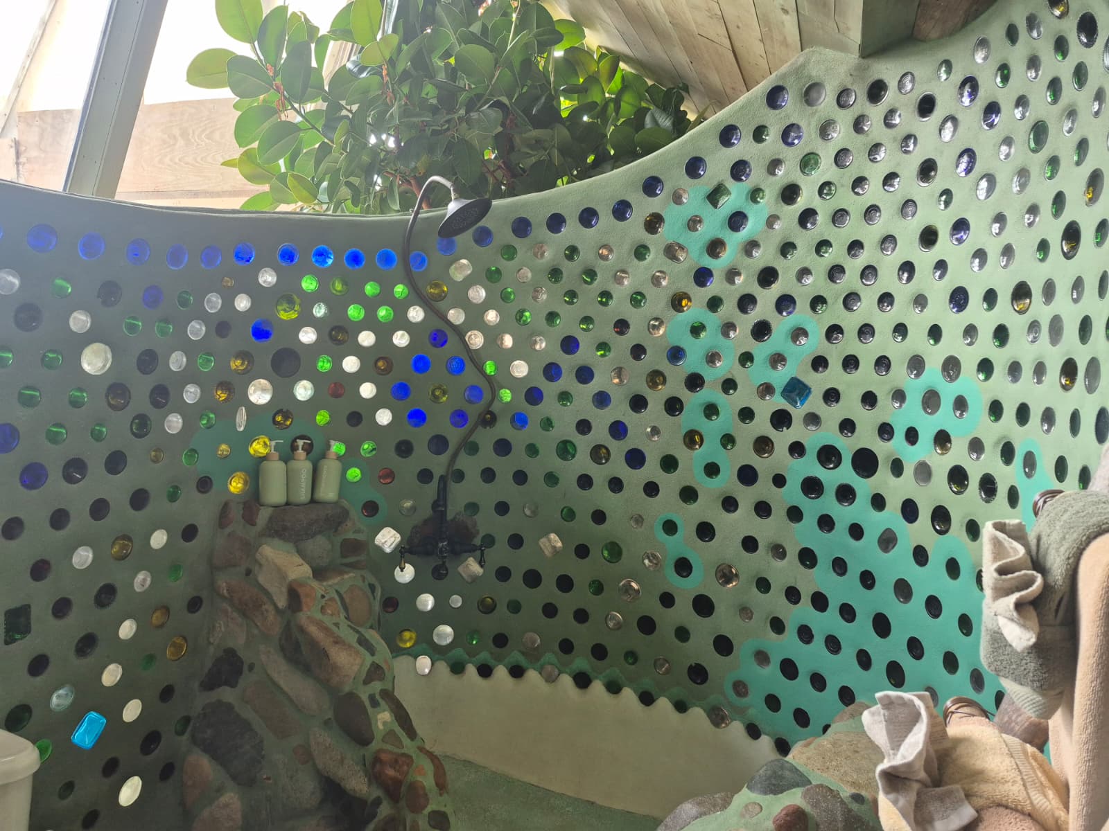 Full of whimsy, warmth, color and texture, this earthship shows that sustainability can co-exist with luxury and comfort. The house itself is a work of art with its custom tin light fixtures, stained glass windows, and light-filled bathing areas made from multi-colored glass bottle walls. A woodstove adds extra warmth and provides backup to the solar-powered heat.