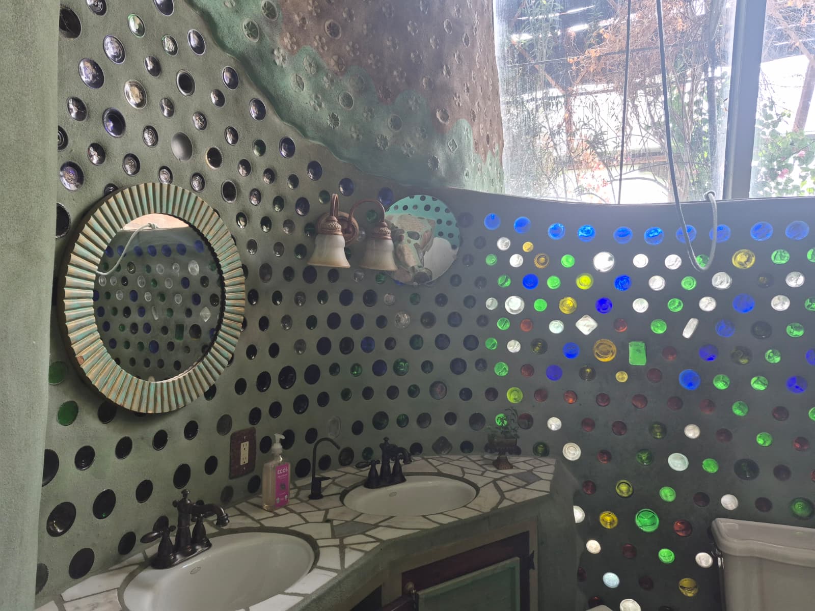 The greenhouse is complete with fish-ponds that hold tilapia that can be eaten for dinner. Tangerine trees provide fruit for margaritas and there are banana trees and tropical birds. Everywhere the sound of water flowing from the greenhouse fountains is heard. Although the greenhouse is beautiful, it serves a purpose too: feeding the residents and recycling gray and black water from the home.
