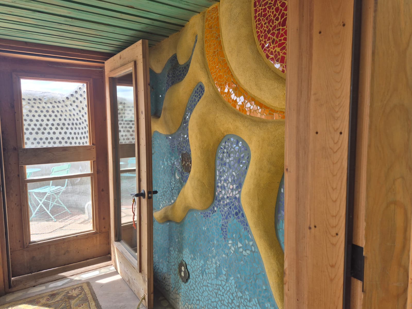 “We have artists on our crew that have made this home beautiful,” says Earthship Biotecture founder Michael Reynolds. “This is a ship is that is going to sail and take care of the people in it. We are making a statement that we need to get closer to the earth, otherwise we are not in touch with it and ruin it. The earth is the thing that takes care of us. We want to encounter the earth, not ignore it or abuse it. Here you are living with water, fire, fruit, fish and birds; you are living with the earth.”
