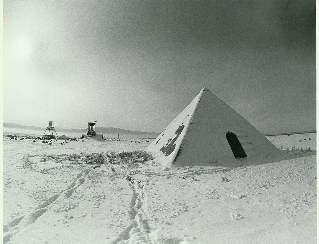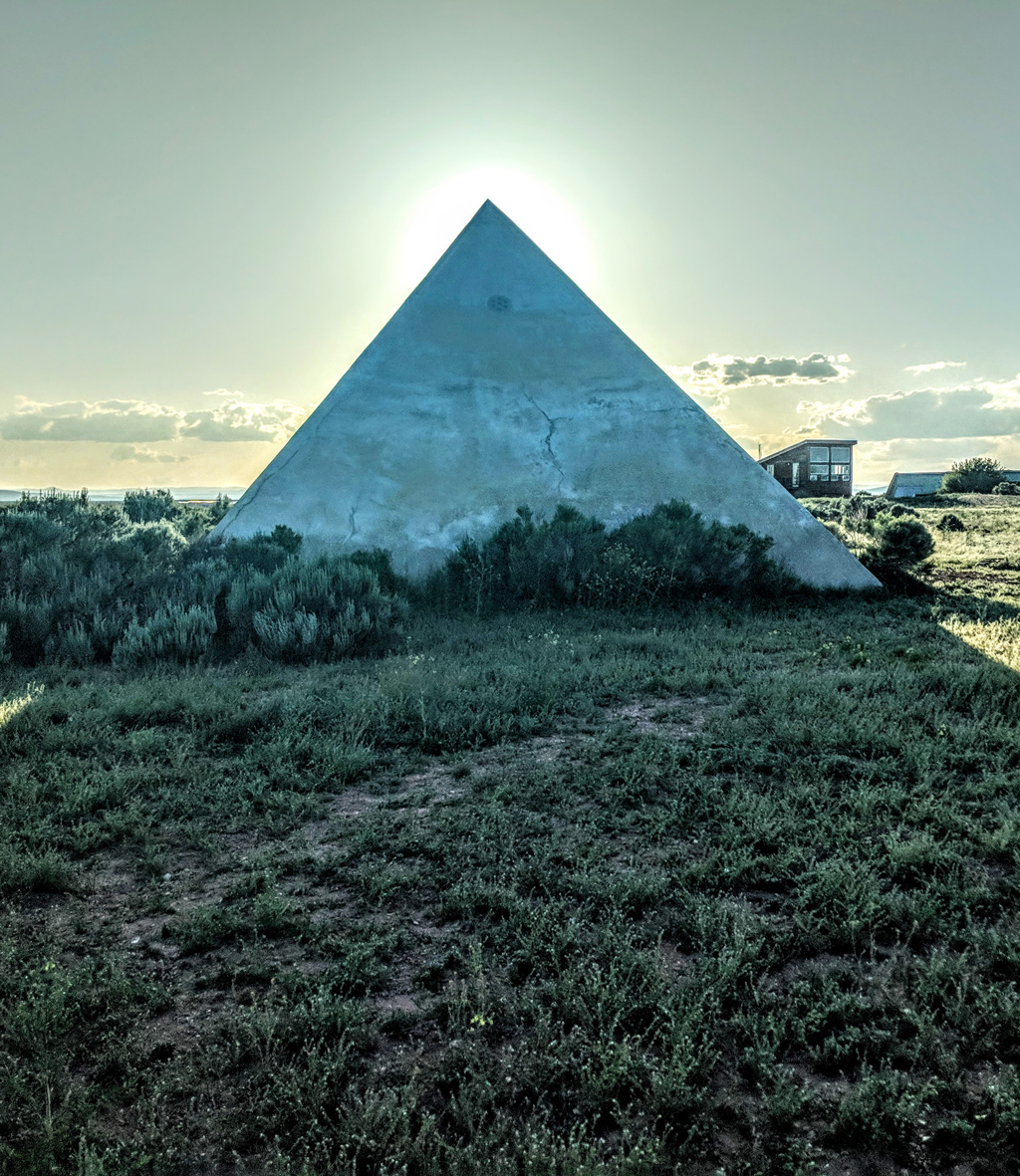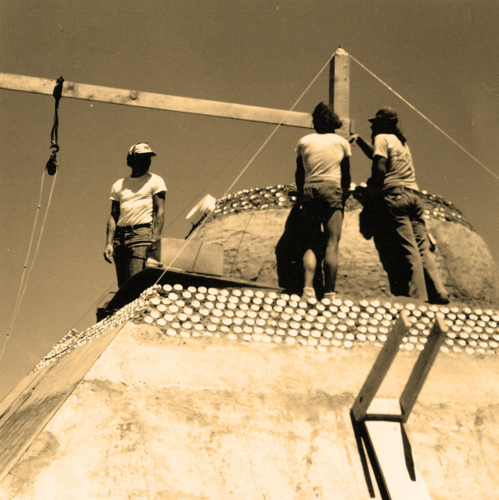 Pyramid made of recycled aluminum cans, aligned true north. 1980s