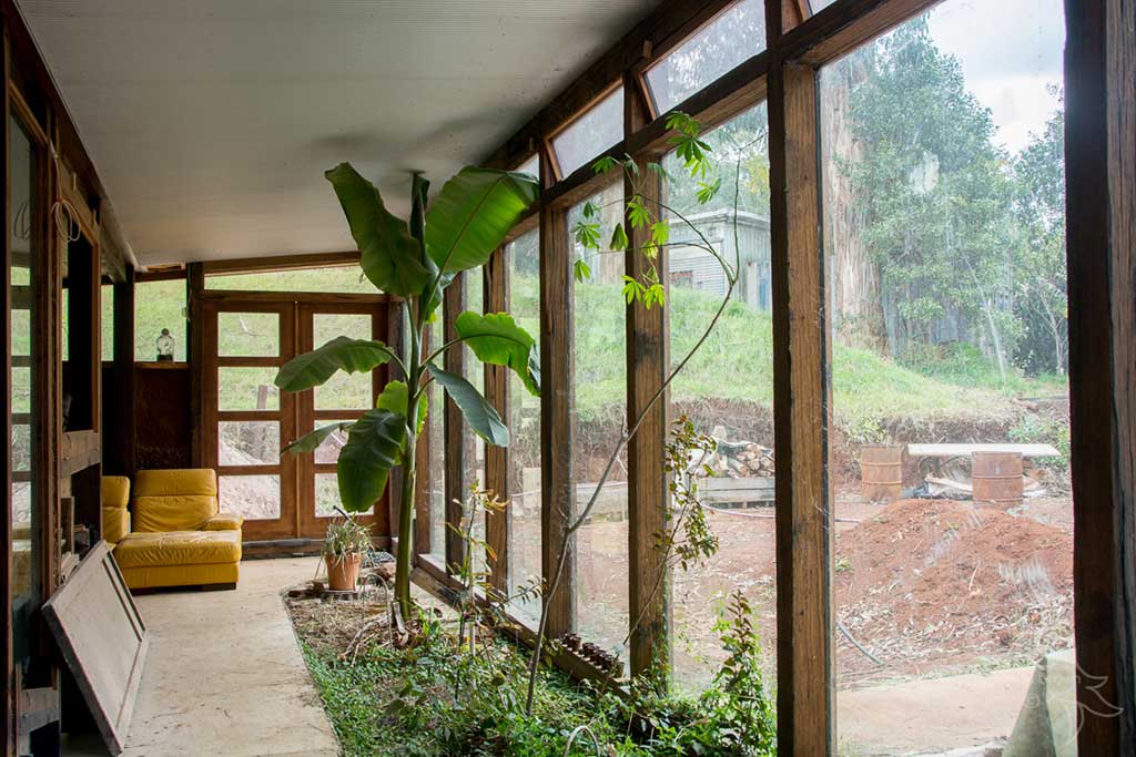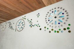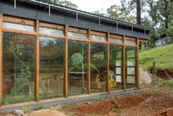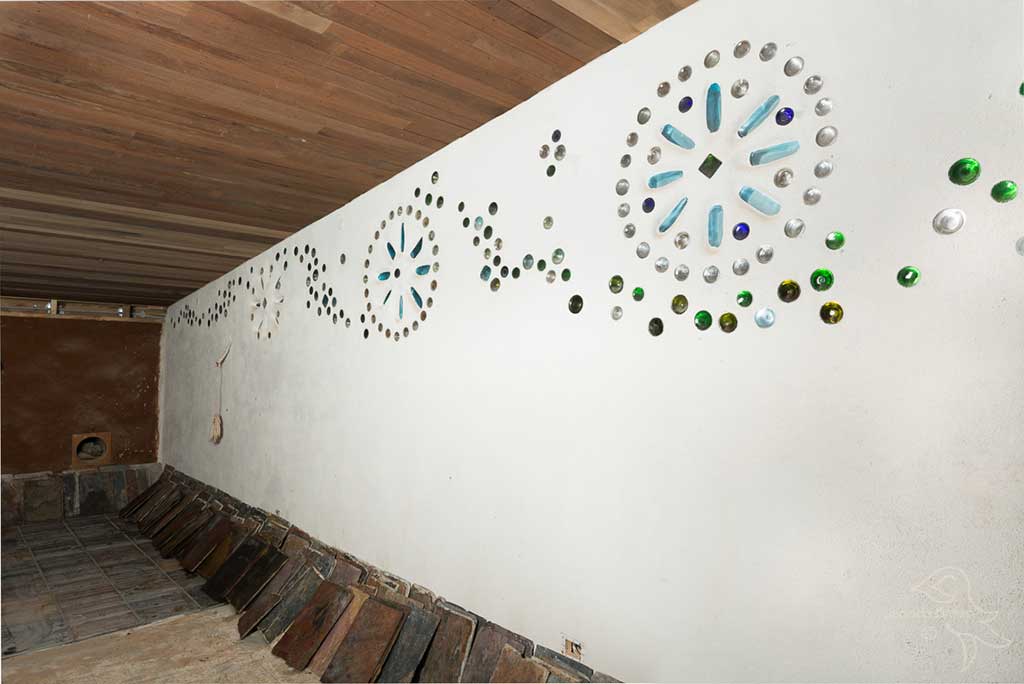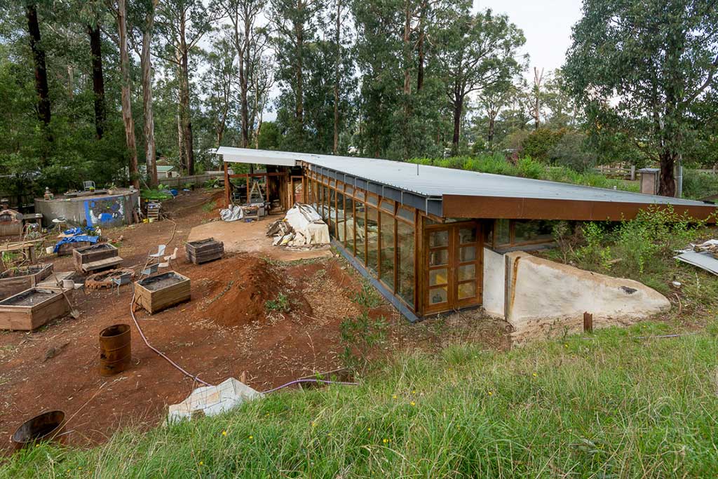 The building is constructed from second hand and redundant object upcycled materials, and is solar passive, and uses no fuel or energy for space heating or cooling (and performs at a 20+ star rating).