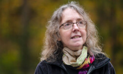 Liz Hatch explains the design features of her earthship home under construction in Greensboro on Friday, September 25, 2020. An earthship is a home constructed of recycled materials that is designed to be heated by passive solar. Photo by Glenn Russell/VTDigger